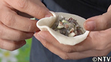 皮に餡をのせ左手の親指で飛び出してくる具を抑えながら、右手で生地を折りたたむ。 最後の折り目は最初の一折り目に押し込んで小籠包の形に。 |