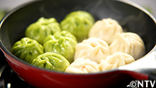 玄米油を敷いて温めたフライパンに小籠包を乗せ、水を加えて蓋をして10分待つと、焼き小籠包の完成。 |