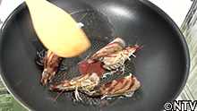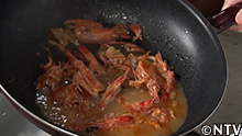 クルマエビの殻と身を分ける。 殻(頭と尻尾など)を台湾では定番の玄米油で炒め、そこに料理酒を加える。 |