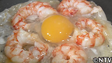 殻をむいたエビを炒めたら、水溶き片栗粉を加え、鴨の卵を落として軽く崩したら、アスパラガスとエーサイをのせて焼く。 |