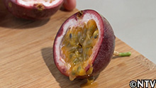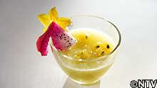 フレッシュジュースにパッションフルーツタピオカを入れ、ドラゴンフルーツとスターフルーツを飾れば完成。 |