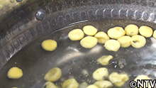 パッションフルーツの生地に片栗粉をまぶして、1cm程度にちぎって丸める。 全て丸め終わったら、沸騰したお湯で15分。浮かんでくるまで茹でる。 |