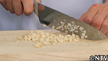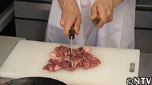 2.豚肉を叩いてミンチにしてひき肉にする。 |