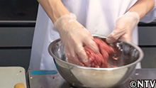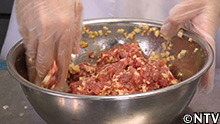 3.ミンチにした豚肉を、塩コショウで味を付けよくこねて粘り気を出す。 |