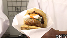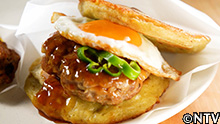 13.ハンバーグ、輪切りにしたピーマン、目玉焼きをジャガイモとレンコンのバンズに挟んで完成! |