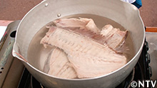 8.水気を切ったうどんに、アラでとった出汁を注ぐ。 |