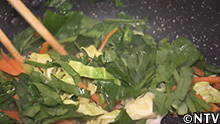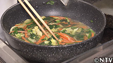 3.食べやすいサイズに切ったニンジン、キャベツ、ホウレンソウをごま油をひいたフライパンで炒める。 |