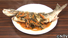 ウグイを丸ごと揚げたうえに、ニンジン・キャベツ・ホウレンソウで作った野菜たっぷりの甘酢餡をかけた『0円ウグイの姿揚げ 甘酢餡かけ』。 |