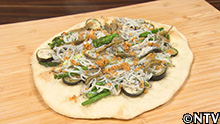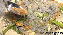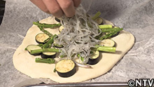 5.生地に、切ったナス、アスパラ、シラウオをのせる。 |