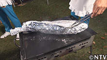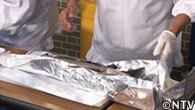 1.塩とコショウ、オリーブオイルで味付けしたスズキをアルミホイルで包む。 |