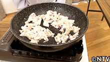 2.豚のホルモン(豚の小腸のあぶら)をフライパンで炒める。 |