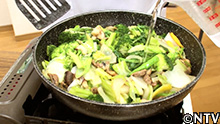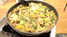 3.脂を炒めたフライパンに、ニンジン、大根、タマネギ、白菜、キャベツ、シイタケ、ネギ、花菜、ブロッコリーなどを加えて炒める。 |