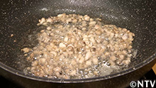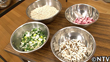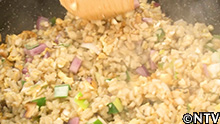4.溶き卵、(2)の麺を入れて炒め、赤カブ、シイタケ、ネギを加える。 |