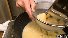 7.卵、小麦粉、砂糖、牛乳の代わりに水を入れ、良くかき混ぜてザルで濾す。 |