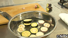 1.ナスとゼブラナスを輪切りにしたものを、水に浸してアク抜きをする。 |