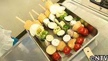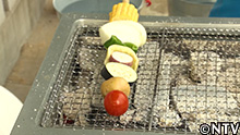 3.トウモロコシ、タマネギ、ピーマン、バナナピーマン、輪切りにしたナスとゼブラナス、ジャガイモ、さらにミニトマトを鉄串に刺す。 |