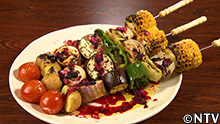 大きめに切った野菜を鉄串に刺し、炭火で焼いた野菜串に、ブルーベリーと玉ねぎで作ったブルーベリーソースをかけた『0円野菜串~ブルーベリーソース仕立て~』。 |