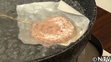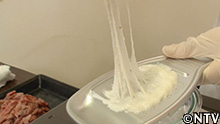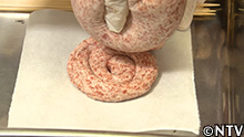 3.常陸牛と自然薯で作った肉だねを袋に移し、絞り出す。 |