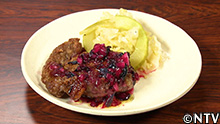 5.みじん切りにしたブルーベリーに刻んだタマネギを加え、酢、オリーブオイル、塩、砂糖、黒胡椒で味を調えたブルーベリーソースをかけたら完成! |