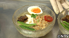 4.麺に見立てて作った細切りの大根を茹で、(3)のスープと合わせたら、自然薯・オクラ・インゲン・トマト・ゆで卵、イワシの煮付け、納豆と枝豆をブレンドしたものを盛り付ける。 |
