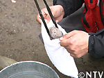 新しい石を好みやすいというナマコの習性を利用し、それに適した護岸の石を、両脇をロープで支えて入れていく。