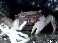 体長:4㎝程 石積みされた護岸の隙間などでよく見られる。 塩性湿地や河口域の砂地に穴を掘って生息する。 名前の通り、体の色は黒褐色で、甲羅はデコボコしている。 脚に硬く長い毛が生えており、ハサミは紫がかった色をしている。