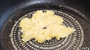 6.(5)で引き出した豚肉の脂ですりおろしニンニクと薄切り玉ねぎを炒める。 |