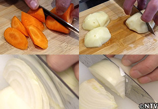1.ニンジンは乱切り、ジャガイモは8等分、玉ねぎ半分は薄切りに、もう半分は櫛切りにする。 |
