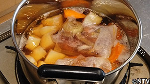 7.火を一旦止め、スープストック・豚肉・ニンジン・ジャガイモ・ローリエを入れ火をつけ、ひと煮立ちさせる。 |