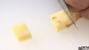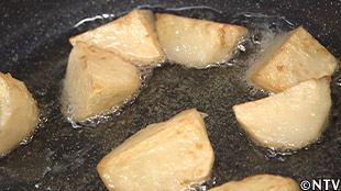 3.(2)で茹でたニンジンとジャガイモを取り出し、ジャガイモは180gの油で素揚げする。 |