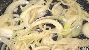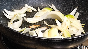 4.(3)のフライパンで櫛切りにした玉ねぎを炒める。 |