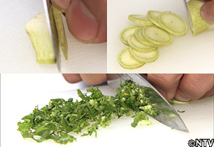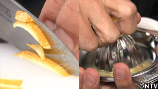 3.レモンの皮を剥き、千切りに(1個)、実は絞って果汁を抽出する(半個)。 |