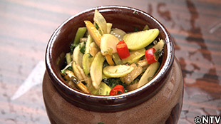 1.辛味大根(普通の大根でも可)の主根の大きなものは輪切り(2~3個)に。 |