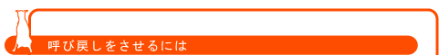 最初は遊ばせ自由にさせる。いずれ飽きて飼い主たちの所に戻ってきたくなるまで、また、こちらが気にするようになるまでただ、ひたすら待つ。 犬の方から近づいてくる、又は戻ってきたら思いきりみんなで褒める。 これを繰り返すことで呼ばれても帰らなくていい、また遊んでもらえるという、認識をあたえる。そうすることで、名前を呼ぶと戻って来るようになる。