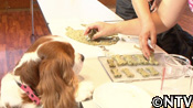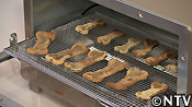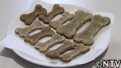 <作り方> @ モロヘイヤを包丁で細かく刻む。 A 刻んだモロヘイヤをペースト状にする。 B ペースト状にしたモロヘイヤを米粉100gとふすま30gに混ぜ、80mlの熱湯を加えながらしっかりとこねる。 C 出来た生地を厚さ1〜2mmほどに伸ばし、骨型に型を抜く。 D その型を、オーブントースターで5〜10分間焼く。