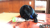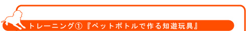 底をあけたペットボトルにロープを通し、結び目を作って抜けないようにしたらまた塞ぎ、その中にモロヘイヤクッキーを入れる。 犬がロープを上下に動かしたり、転がすことでクッキーが出てくるので、遊びながらおやつが食べられる。普段、家の中では全く動かない犬たちの家庭内エクササイズとして効果的。