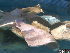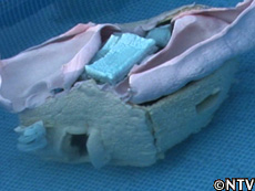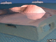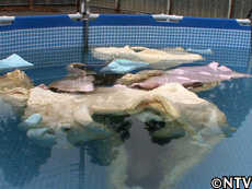 太一が憧れのマイホームを夢見て挑んだ“持ち運べる家"作り。 水でふくらむ懐かしいオモチャをヒントに、紙オムツに使われる吸水性ポリマーと、ゴム風船の倍の伸びを誇る熱可塑性(ねつかそせい)エラストマーで、縦横幅80cm、高さ70cmの家を組み立てた。 そして期待を胸に、家を3倍にするべくプールの中へ入れて1週間。 水を吸った家がドンドンふくらんで、人が住める大きさに… のはずが、遠く及ばず、屋根が水面から飛び出した程度。 |