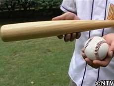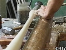 約110センチのホウノキの角材をロクロにかけ、まずは丸バイトという刃物で荒削り。四角い角材を、円棒に加工していく。 丸バイトで削った表面は、波打ったようになっている為、先の本削りは平たいバイトで表面の薄皮を削ぎ落とし、バットの美しいフォルムに変えていく。 削り終わったバットは表面を磨いた後に、ウレタン樹脂を塗って湿気を防ぐ。通常のバットより1,5倍量のウレタン樹脂を塗り終えたら乾燥。 バット規格ギリギリ106,7センチでも、軽量素材で800グラム。 『素人でも簡単にホームランが打てるバット1号』が完成。 |