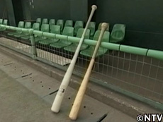 約110センチのホウノキの角材をロクロにかけ、まずは丸バイトという刃物で荒削り。四角い角材を、円棒に加工していく。 丸バイトで削った表面は、波打ったようになっている為、先の本削りは平たいバイトで表面の薄皮を削ぎ落とし、バットの美しいフォルムに変えていく。 削り終わったバットは表面を磨いた後に、ウレタン樹脂を塗って湿気を防ぐ。通常のバットより1,5倍量のウレタン樹脂を塗り終えたら乾燥。 バット規格ギリギリ106,7センチでも、軽量素材で800グラム。 『素人でも簡単にホームランが打てるバット1号』が完成。 |
