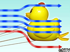 すると、曲線状の丸い入口であれば、空気の乱れは少なく、流速も早められ、空気を取り入れられる量も多いことが判明。 長瀬も改めて構造を確認。 長瀬「(エアインテークの縁が)Rの形になってるね」 そのRの形状に着目し、村長のクチバシに取り入れ、空気の取り込み口は“たらこ唇"型に決定。 |