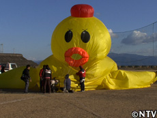 空気口となる、たらこ唇型のクチバシは、発泡スチロールの土台にカーボンの骨組みを作り、袋状のリップストップポリエステルに入れて作成。 村長らしいつぶらな目を貼付け、厚い唇に、広げた左右の翼、オリジナルとは多少変化を遂げた100倍アヒル村長立体凧が遂に完成! |