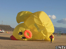 クチバシと左右の翼から空気を送り続けることで100倍村長は立ち上がり、準備万端! 長瀬、松岡が引き手となり、全力疾走! わずかに浮かび上がる村長! と間もなく、村長は大きく傾き、横転! 原因は、唇の空気口が小さすぎ風圧で押しつぶされ、たるんだ翼が機能しなかったこと。 その結果、6秒浮いただけでバランスを崩し、回転してしまった。 |
