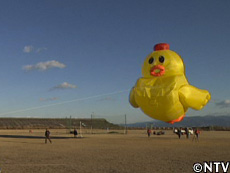 いよいよ、凧揚げに挑むため、富士川の河川敷へ! まずは、空気を入れて膨らませないといけないが、体積が60万リットルの巨大村長は、なかなか膨らまない。 そこで、村長のお腹をカットし、新たな空気口を増やす。 さらに業務用の送風機を使って、膨らます作戦に。 |