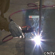シゲコプター発射台の作製時に使用した、溶接機械。 一般的にプラス極を溶接棒に、マイナス極を材料となる金属に接続し、それらを接することで金属と溶接棒との間にアーク(火花)を発生させ、その熱を利用し、分子・原子レベルで融合一体化させて、溶接する。