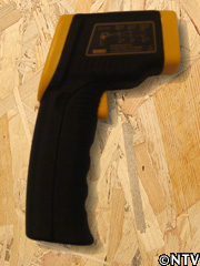 メガうまい棒を作る際、技術者の方がパフマシーンのシリンダーやノズルの温度を計測するときに使用。 低温の赤外線を照射し、直接物に触れずに対象物の温度を計測できる。温度計の温度を対象物と同じにする必要がないため、短時間で計測できることも利点の一つ。