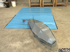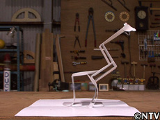 続いて、達也が訪れたのは、イルカなど多くの海獣を飼育する千葉県鴨川シーワールド。 フレンドリーなシロイルカと声真似のコミュニケーションで交流し、さっそく体の計測。体長は4m70cm。 続けて、「泳ぎの達人」と称されるバンドウイルカの、躍動的な動きを観察。それらの動きを再現する為に、多面体からなる箱をつくり、 中のゴムで引っ張ることで飛び上がる仕掛け「パカポン」を製作する。 |