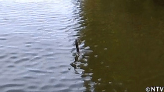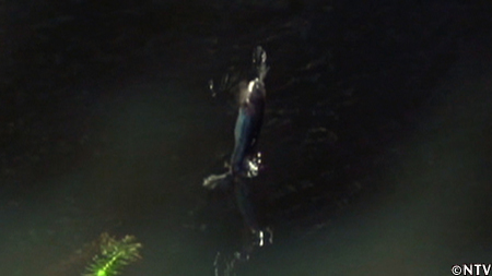 30分に一回ほど、息継ぎをするために水面に姿を現わしたところを、すかざずタモ網ですくって捕獲。 |