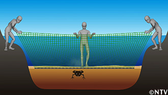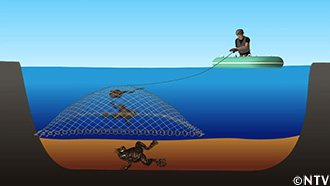 そのために、水深の浅い池で、底まで届く追い込みネットを池全体に広げて引っ張り、池底を足で撹拌しながら、泥の中のカエルをネットの中に追い込む。 |