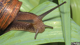 アフリカマイマイを始めとするカタツムリには、4本の触角があり、視覚と聴覚を司っている。 |