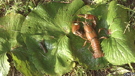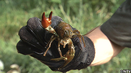巣穴から出てきたウチダザリガニを、ハサミに挟まれないように注意しながら手や網で捕獲! |